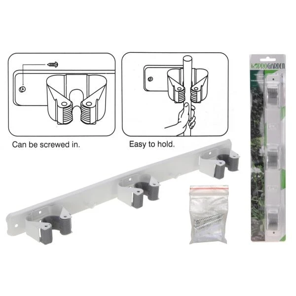 Tuingereedschapshouder met 3 klemmen voor borstelstelen. Tussen de drie klemmen zijn ook nog eens haakjes voorzien voor kledij of vaatdoeken.